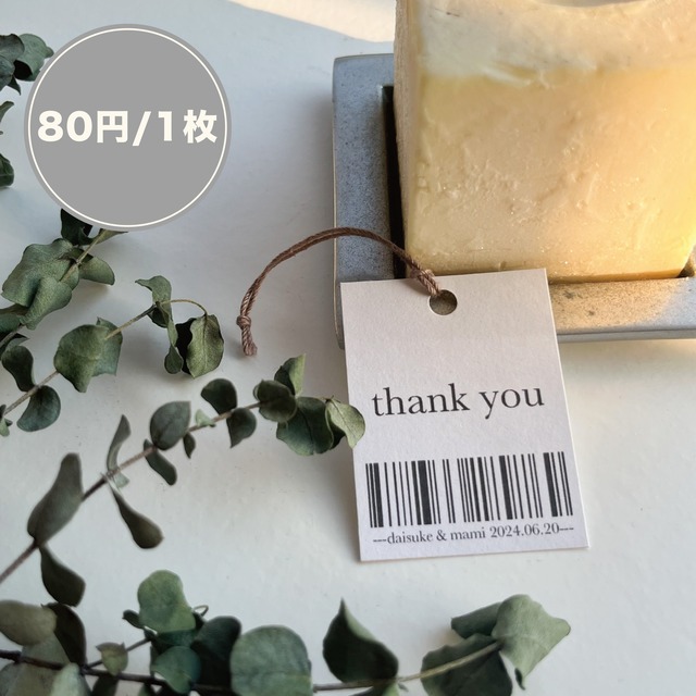 結婚式のプチギフト等のラッピングにピッタリなサンキュータグです! 大人っぽい雰囲気でシンプルに仕上がること間違いなし◎ セミオーダーで「お名前」と「日付」をお入れします。 【用紙】 画用紙 【上部仕様】 ・穴開け無し ・穴開け有り ・穴開け有り+紐付きA ・穴開け有り+紐付きB 【納期スケジュール】 ①注文(カートに必要数お入れください) ↓ ②備考欄に下記事項を記入ください ・入力するお名前(ローマ字) ・日付(日付なしご希望の方は「日付無し」とご入力ください) ↓ ③2週間程度で発送 ※受注の状況によってもう少しお時間いただく場合があるかもしれません。 【注意点】 1つ1つ丁寧に作業を行いますが、自宅のプリンターにて印刷いたしますので多少のズレやインクにじみが生じる場合もございます。 ご了承いただきました上でのご購入をお願いいたします。 他の製作状況によってお届けに時間をいただく場合がございます。余裕を持ったご購入をお願い致します。 【SNS掲載】 オーダーをいただいた商品はSNSでご紹介させていただく場合がございます。 掲載を希望されない場合はご連絡をお願いいたします。 その他ご質問等ございましたら、注文前でも構いませんのでお問い合わせくださいませ。 特別なイベントで使用するものだからこそ、納得のいくものをお届けしたいと思っております! ーーー シンプル ナチュラル 大人っぽい 可愛い かわいい セミオーダー 名入れ 日付入れ ーーー