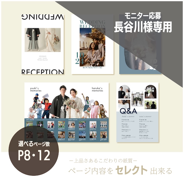 【購入方法】 100部の50%OFF価格になっております。 モニター応募の場合はこちらからご購入お願いいたします。 約40~45日前になりましたらアルバムに使用する お写真等のご提出依頼のご連絡をいたします! それまでに使用するお写真やその他入力文言のご準備をお願いいたします。 【サイズ・ページ数】 A5サイズ(開くとA4サイズ) 全12ページ(表紙込み) 【デザイン変更】 アルバムページデザインは「アルバムデザイン一覧」から変更も可能です。(背景カラー・フォントカラーはお好きなカラーに変更可能)(追加料金なし) サンプル画像のようにシンプルに写真1枚or2枚等の配置も可能です。(追加料金なし) 写真のカラー・モノクロ変更も可能です。(追加料金なし) 【商品】 写真・文言についてはお客様のご希望通りに制作いたします。 ページタイトル名のご変更も可能です。 (例:「私たちの物語」→「自己紹介」など) 【用紙】 マットな質感で高級感のある用紙を使用しております。 厚みは画用紙程です。 中綴じ冊子で、中央ページにホチキス止めのある仕様です。 【デザインの修正】 デザインに関する修正は3回まで無料で承ります。(写真のモノクロとカラーを変更など) それ以上の修正については1回につき500円で修正させていただきます。 【注文部数】 5部単位でご注文お願いいたします。 【料金】 5部:32240円 10部:32950円 15部:35660円 20部:34370円 25部:35080円 30部:35790円 35部:36500円 40部:37210円 45部:37920円 50部:38630円 55部:39270円 60部:39910円 65部:40550円 70部:41190円 75部:41830円 80部:42470円 85部:43110円 90部:43750円 95部:44390円 100部:45030円 100部以上の金額はお問い合わせくださいませ。 【SNS掲載】 オーダーをいただいた商品はSNSでご紹介させていただく場合がございます。 掲載を希望されない場合はご連絡をお願いいたします。 その他ご質問等ございましたら、注文前でも構いませんのでお問い合わせくださいませ。 特別なイベントで使用するものだからこそ、納得のいくものをお届けしたいと思っております! ーーー シンプル キレイめ モノクロ モノトーン 可愛い かわいい セミオーダー 席次表 メニュー表 ーーー